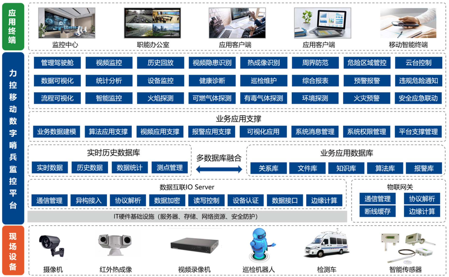 力控移動數(shù)字哨兵監(jiān)控平臺支持探測裝置、智能傳感器、視頻圖像、安防報警以及各類工業(yè)設(shè)備統(tǒng)一接入管理,實現(xiàn)各維度數(shù)據(jù)統(tǒng)一展示分析,并結(jié)合算法模型實現(xiàn)AI識別、危險提醒、數(shù)據(jù)分析、預(yù)警等智能應(yīng)用, 提高現(xiàn)場安全防范、智能運維能力,該平臺目前已廣泛應(yīng)用于石油、化工、礦山、樓宇、變配電、交通、環(huán)保等領(lǐng)域。