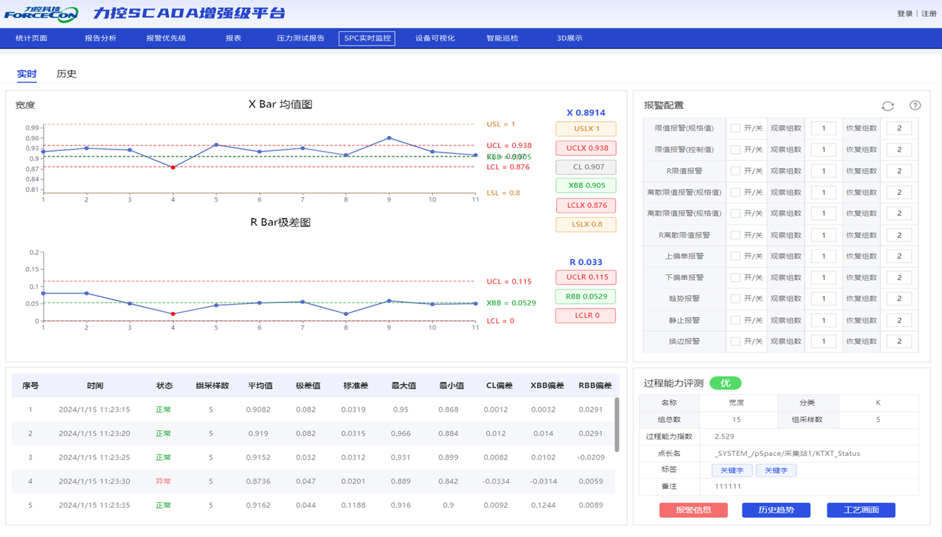 力SCADA質量管理是專業(yè)的質量過程管控工具,產品基于SCADA實時生產過程數據,生成各類控制圖表,對來料、半成品、成品等實現全面質量監(jiān)控,及時發(fā)現生產過程異常,實時推送異常數據,提供失控標注處理機制,持續(xù)優(yōu)化質量,對傳統(tǒng)SCADA的質量功能進行擴展與增強,實現質量管理透明化、科學化,幫助企業(yè)不斷提升質量管理水平。