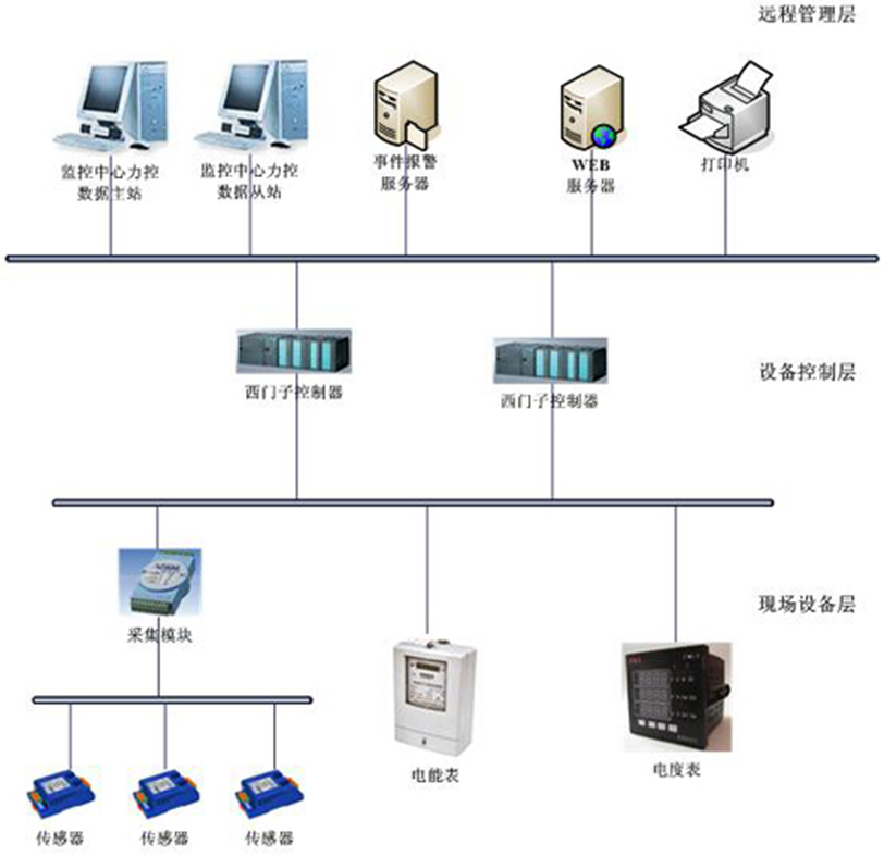 系統(tǒng)采用分布式體系結(jié)構(gòu),按照縱向分為遠程管理層、設(shè)備控制層和現(xiàn)場設(shè)備層三大部分。