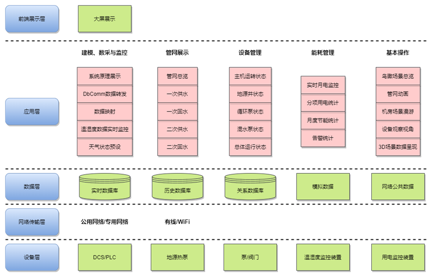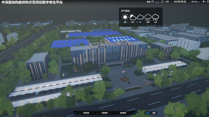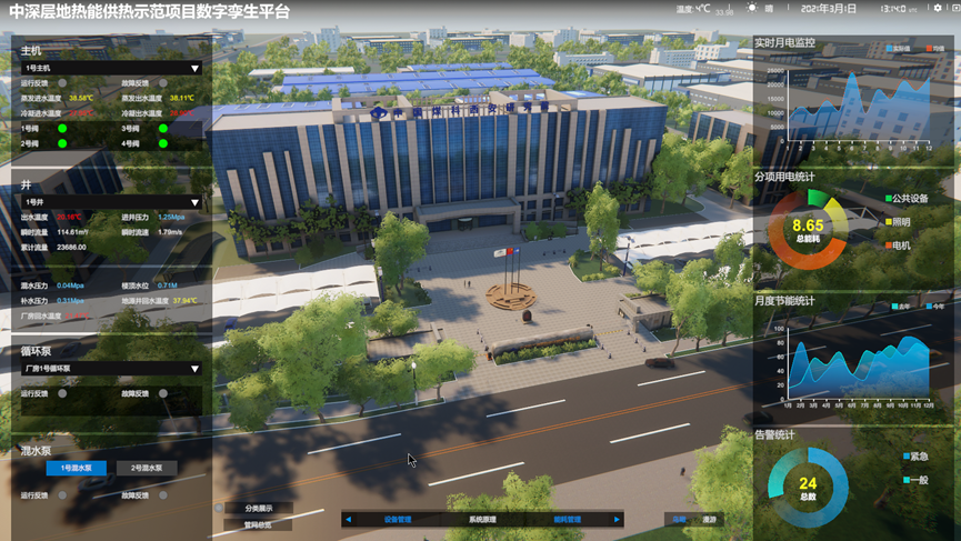 本軟件通過對中煤科工西安研究院地熱供暖泵房、主辦公樓及周邊輔助建筑物的供暖制冷需求搭建高精度1:1三維模型和工藝數學模型,通過三維可視化監控界面實現主要供暖、制冷區域的溫濕度監測,及泵房主要設備溫度、流量、壓力等運行參數監控;