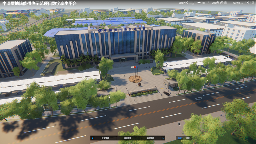 力控科技利用最新的計算機圖形技術所提供的強大三維展示能力,結合公司自主研發的數據庫和自動化平臺,以及客戶的實際案例,實現了對中深層地熱能供暖技術的真實展現,將“實體空間”和“虛擬環境”融合在一起,并依據實際供熱過程中所采集的實時數據,實現了在三維環境中的集成展示。