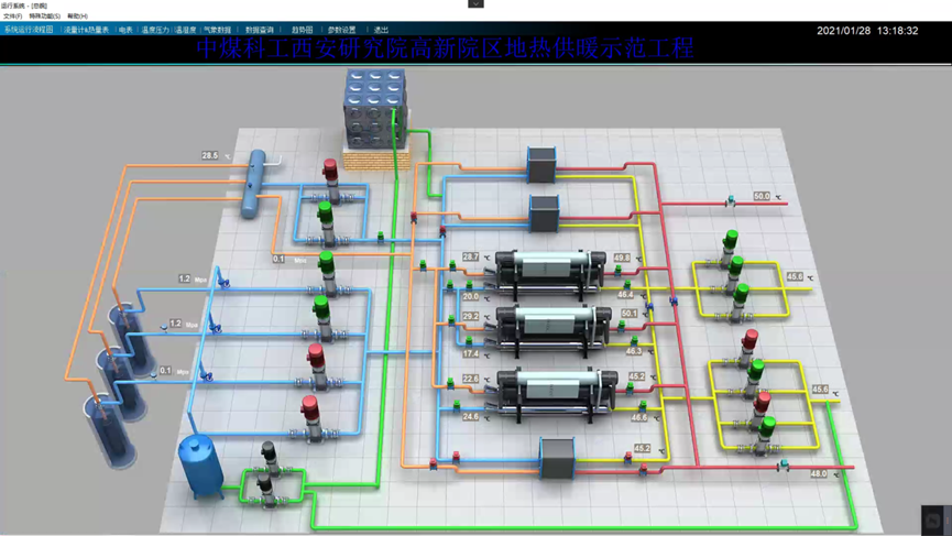 本軟件通過對中煤科工西安研究院地熱供暖泵房、主辦公樓及周邊輔助建筑物的供暖制冷需求搭建高精度1:1三維模型和工藝數學模型,通過三維可視化監控界面實現主要供暖、制冷區域的溫濕度監測,及泵房主要設備溫度、流量、壓力等運行參數監控;結合工藝數學模型仿真計算結果、提供運行控制參數合理化建議;整個系統具備歷史數據查詢、分析、能耗管理、仿真培訓、設備運行參數優化等功能,該項目的成功實施起到了推廣數字孿生平臺應用、促進兩化融合的先進示范效應。
