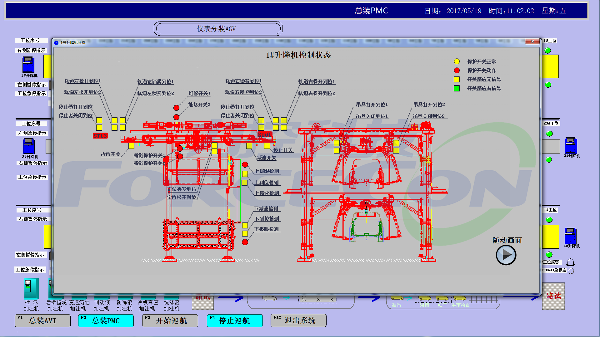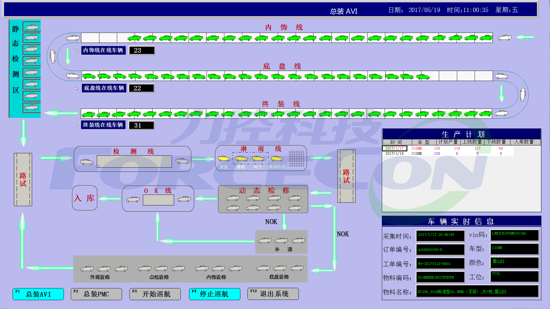 AVI車輛跟蹤實現對現場車輛數量及車輛信息(訂單編號,工單編號,物料編碼,物料名稱,VIN碼,顏色,工位,車型等)的實時信息采集在CCR中控平臺的展現實現車輛動態生產過程中的可視化,實時顯示AGV運行狀態信息、工位詳細車型信息等。