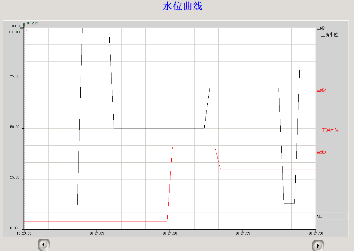通過實時曲線可以查看水位的實時數(shù)據(jù)和趨勢走向,還可以通過曲線下面的按鈕向前向后調(diào)節(jié)坐標(biāo)軸的時間,查看其它時間的水位情況。