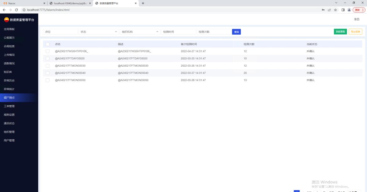 僵尸測點的來源通過定下的規則,判斷為僵尸測點后,顯示在“僵尸測點”的界面中,界面展示了該測點的點名、描述、首次檢測時間、檢測次數和當前狀態。可通過左上角查詢條件查詢出一個時間段的僵尸測點。