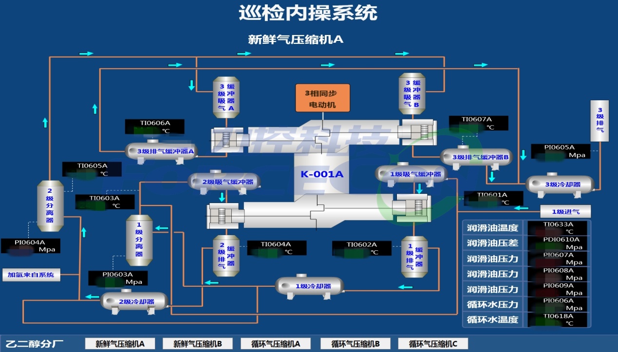 本次項(xiàng)目的實(shí)施范圍覆蓋庫布齊園區(qū)生產(chǎn)基地3個(gè)分廠,共計(jì)43條巡檢路線。內(nèi)操巡檢平臺(tái)則主要是針對(duì)這43條路線中的重點(diǎn)巡檢路線上重點(diǎn)裝置,設(shè)備和重大危險(xiǎn)源進(jìn)行集中監(jiān)控管理。監(jiān)控畫面35幅,監(jiān)控點(diǎn)位360余個(gè)。系統(tǒng)依托pSpace實(shí)時(shí)數(shù)據(jù)庫平臺(tái),自動(dòng)記錄各測(cè)控點(diǎn)位的實(shí)時(shí)數(shù)據(jù)。并根據(jù)工藝要求,配置各測(cè)點(diǎn)的報(bào)警信息。智能巡檢平臺(tái)通過標(biāo)準(zhǔn)接口實(shí)時(shí)讀取pSpace數(shù)據(jù)庫中各監(jiān)控點(diǎn)位產(chǎn)生的報(bào)警信息。并將報(bào)警信息與現(xiàn)場(chǎng)監(jiān)控視頻綁定。當(dāng)報(bào)警產(chǎn)生后,視頻監(jiān)控自動(dòng)切換到對(duì)應(yīng)的巡檢點(diǎn)監(jiān)控畫面。同時(shí)智能巡檢平臺(tái)能對(duì)各巡檢點(diǎn)產(chǎn)生的報(bào)警信息進(jìn)行統(tǒng)計(jì)分析,為現(xiàn)場(chǎng)檢修人員制定設(shè)備保養(yǎng)計(jì)劃提供數(shù)據(jù)支撐。除此之外,利用Html5技術(shù),根據(jù)Fsmartworx的跨平臺(tái)特點(diǎn),實(shí)現(xiàn)內(nèi)操巡檢系統(tǒng)與智能巡檢平臺(tái)的融合。