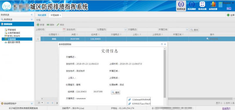汛情發(fā)生后,通過已被調(diào)度的各個模塊來對事故進行處理,合理安排泵站的抽排水、搶險車輛和搶險隊伍等對人員物資的搶救,按照應(yīng)急預(yù)案有條不紊的應(yīng)對各種突發(fā)事故。對已經(jīng)完成的搶險救災(zāi)任務(wù)形成簡報,地圖展示位置信息,可查看處理結(jié)果,對搶險救災(zāi)任務(wù)進行總結(jié),用最優(yōu)的措施保障人民生命財產(chǎn)安全。