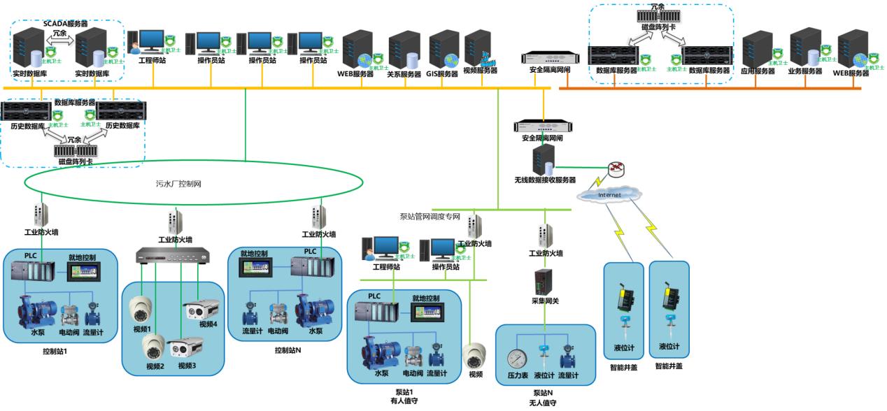 系統架構的設計涵蓋從底層設備到上層軟件應用的所有軟硬件。系統采集各類閥門,流量計,壓力表等現場設備的數據,在場站匯總后通過安全網絡上傳到中心進行數據的分析及展示,監、管、控一體化,實現本質安全型的生產調度、水務運營管理。