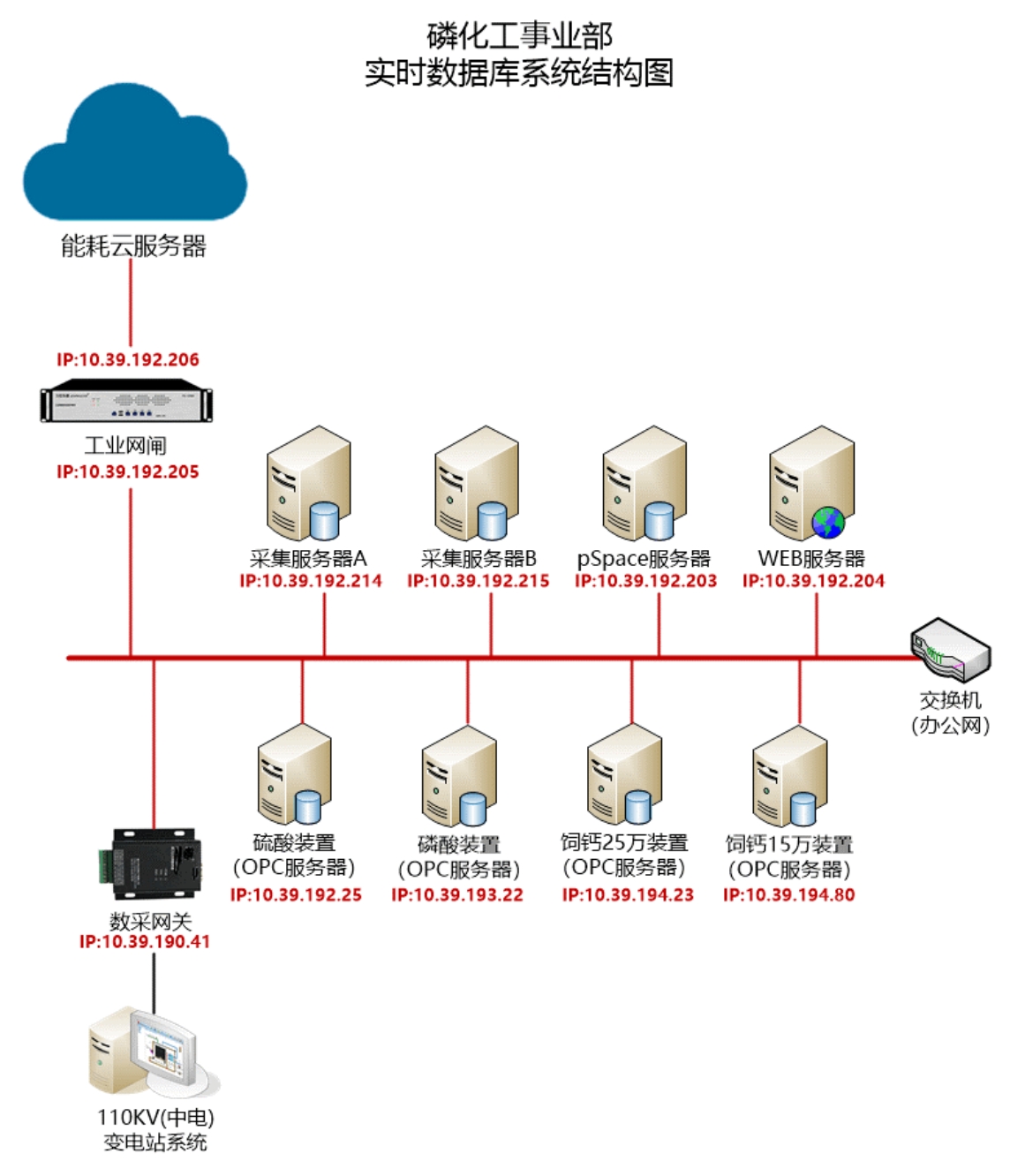 云天化集團——磷化工事業(yè)部實時數(shù)據(jù)庫項目,采用力控科技pSpace軟件和Fwebview軟件建設(shè)而成。磷化工事業(yè)部實時數(shù)據(jù)庫項目中的數(shù)據(jù)涉及電力數(shù)據(jù),為保證電力的絕對安全,電力數(shù)據(jù)使用采集隔離網(wǎng)關(guān)采集數(shù)據(jù),其他DCS通過OPC直接讀取數(shù)據(jù),并將能耗數(shù)據(jù)通過工業(yè)網(wǎng)閘上傳到省級能管平臺。