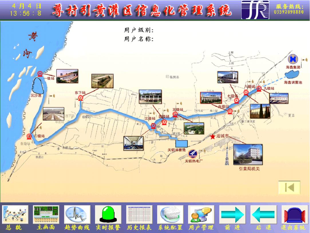 山西運(yùn)城該項(xiàng)目取水來(lái)源為黃河,黃河由于泥沙較大,對(duì)設(shè)備要求相對(duì)較高,山西運(yùn)城水處理系統(tǒng)共設(shè)監(jiān)控中心一處,位于引黃管理局機(jī)關(guān)內(nèi),泵站現(xiàn)場(chǎng)監(jiān)控點(diǎn)12處,分別位于尊村引黃一級(jí)站至九級(jí)站、東下站、海鑫供水站、關(guān)鋁熱電廠供水站等。