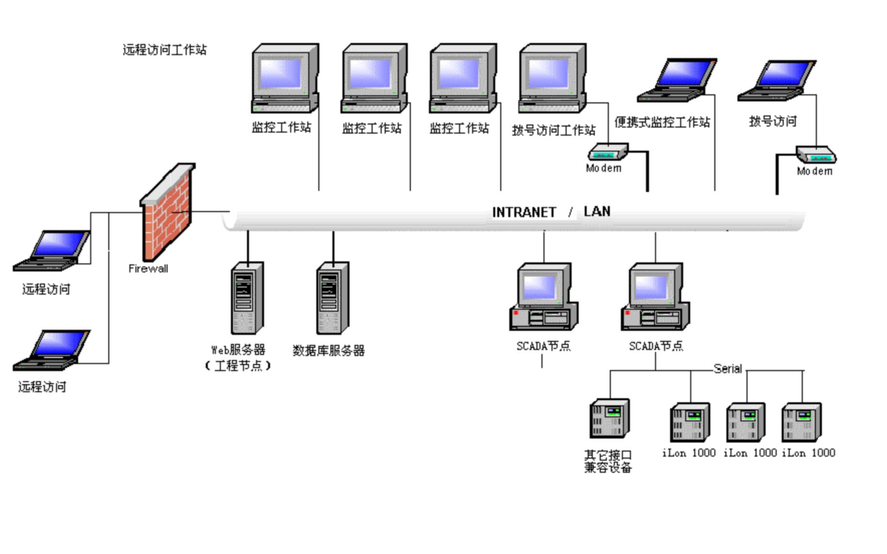 圖中的SCADA節點就是監控節點,即負責數據采集、設備控制和狀態顯示的監控計算機,監控節點(SCADA節點)直接與設備進行實時通信。監控節點物理上通過串口、以太網或其它通信接口來連接硬件設備,典型的設備包括PLC、控制器、直接數字控制系統(DDC)、分布式控制系統(DCS)和IO系統,但在大型的網絡系統中監控節點通常不是一個Web 服務器,監控節點是直接連接到一個下位控制系統的計算機。