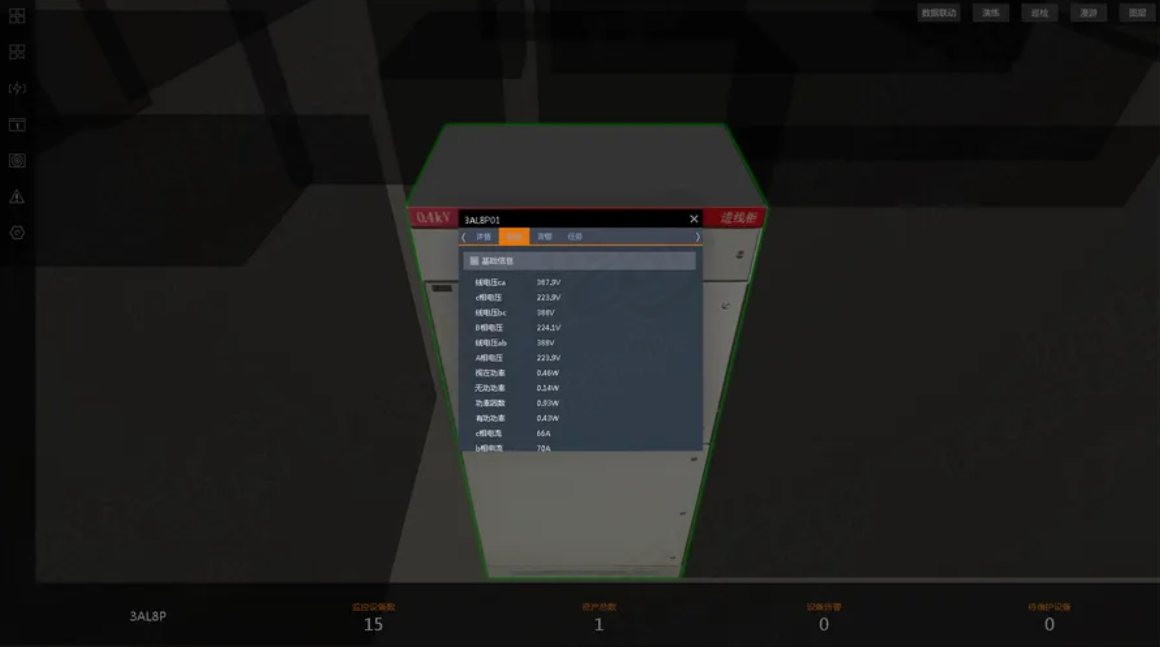 在平臺使用界面中,通過雙擊設備的方式即可調出信息面板,面板中能夠顯示:設備信息、設備運行狀態信息、設備運行參數等內容,便于使用者詳細、直觀地了解到該設備的具體情況,并可實現設備的遠程控制,其結果會直接反映在設備的工作參數、工作狀態上,其可視化效果會跟隨場景,避免突兀和割裂感。