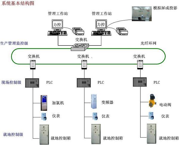 污水處理的方法一般有氧化溝法﹑SBR法﹑鼓風曝氣法﹑AB法﹑A2O法等工藝方法,針對不同的工藝需要制定相應的控制方案,采用生產管理監控級﹑現場控制級和就地控制級三層網絡結構,要求系統具備在線監測及數據采集顯示、遠程自動控制和網絡通訊、檢測數據分析﹑管理、系統監測及故障報警等功能。本污水處理項目電氣自控系統以三菱Q系列PLC和網絡系統為控制系統主干,并配以人機界面來提升操作友好度,同時通過安裝在上位工控機的力控監控組態軟件來監控整個系統的運行狀況。該系統設計要求采用集散型控制系統,采取“集中監測,分散控制”的原則,由廠級中央監控工作站和現場分散就地PLC控制站組成全廠工業控制網。