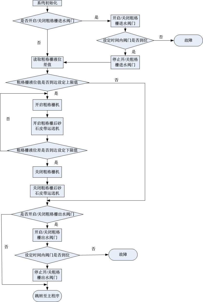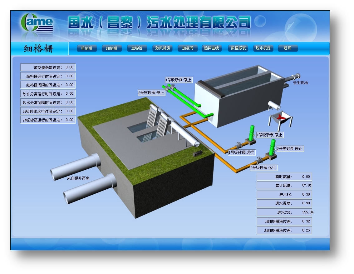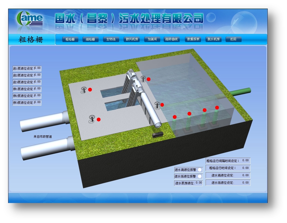 細格柵的間距比粗格柵小,為4mm,主要作用是進一步攔截污水中的污物。需要檢測格柵水位差、流量、泵狀態(tài)等參數(shù)。