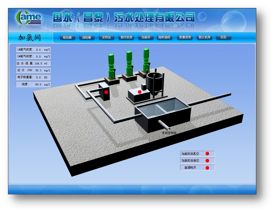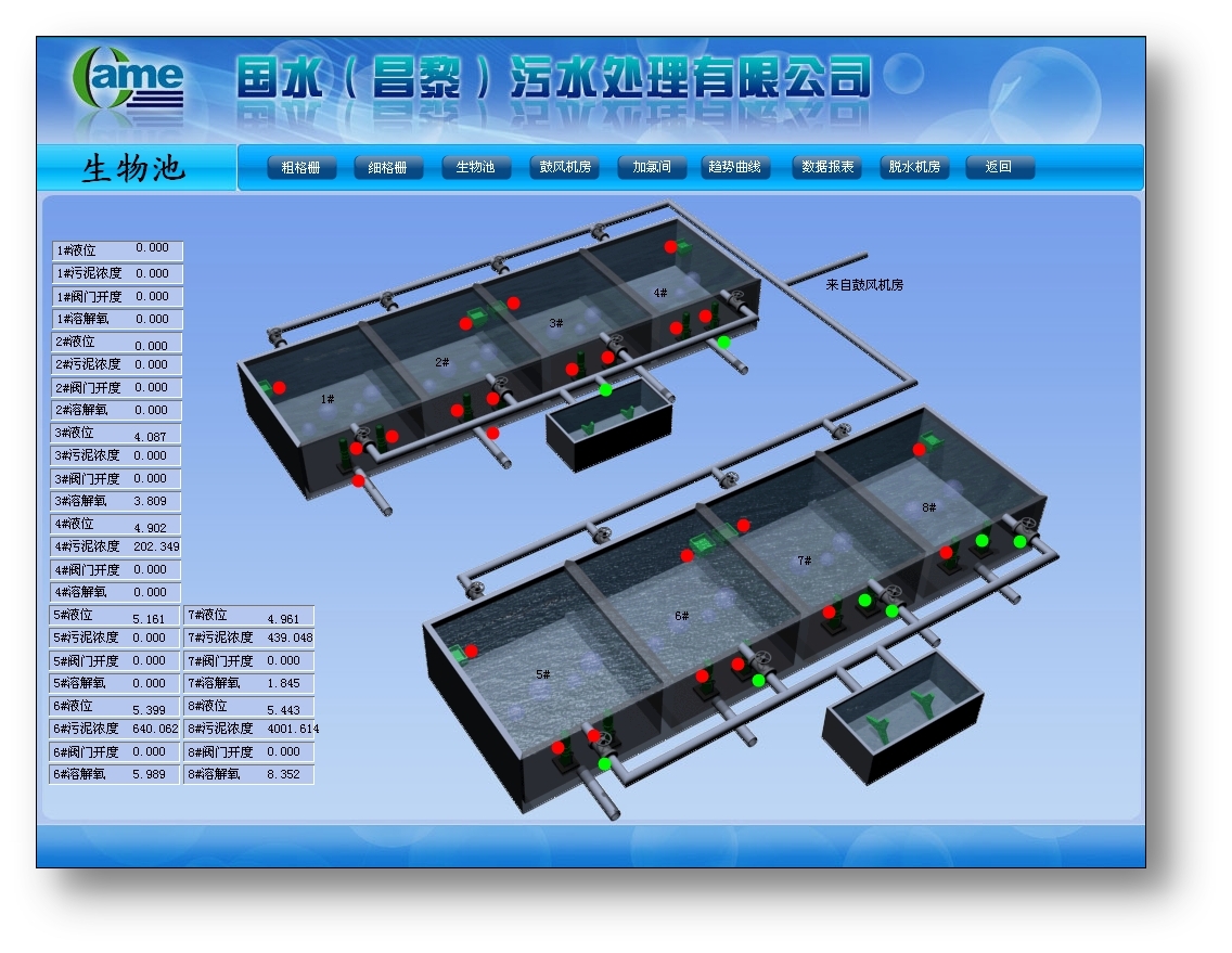 系統(tǒng)以美觀、友好的界面顯示設備運行狀態(tài)、流量、水位、COD、超聲波液位計、溶解氧計、氧化還原電位計、污泥濃度計、電磁流量計等數(shù)據(jù),并以仿真圖、直方圖、曲線圖和棒圖等多種方式清晰直觀地顯示各個敏感數(shù)據(jù),方便用戶對各敏感數(shù)據(jù)進行歷史查詢和對比分析。