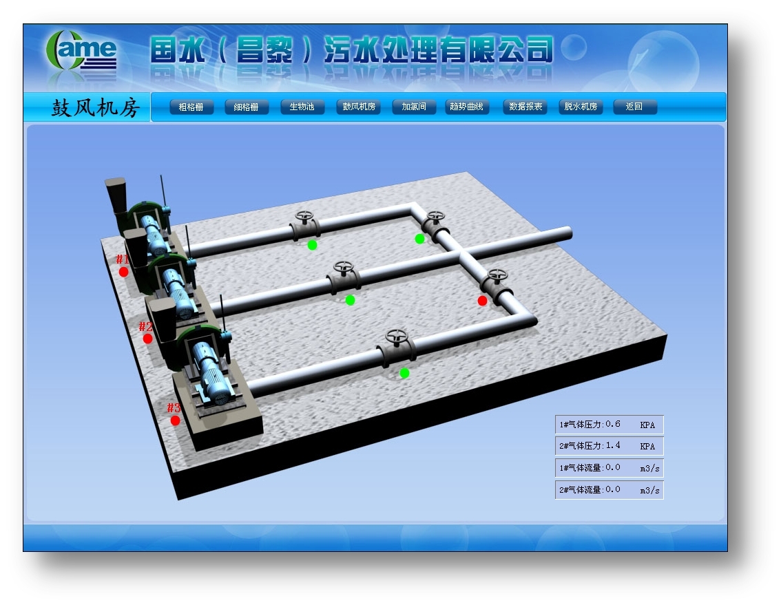 鼓風機房負責對反應池進行鼓風曝氣,該鼓風機房設置3臺鼓風機,兩用一備。需要檢測閥門、鼓風機狀態(tài)等參數(shù)。