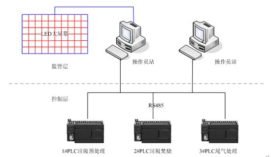 垃圾焚燒處理生產線的監控系統以力控監控組態軟件ForceControl和西門子s7-200系列的微型plc結合組成。以2臺上位計算機和多臺plc通過rs485總線網絡組成監控系統,plc執行實時控制功能,計算機運行人機界面、采集數據、趨勢報警、報表打印和為大屏幕提供監控畫面, 系統監控結構如圖1所示。