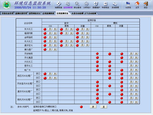 可以在線查看、查詢、獲取各種模擬設備和開關的最新數據、狀況。并可以實現定時監測(TOC、COD、PH、流量等一次性儀表在一段時間內,按照固定的周期進行數據采集)。中心控制室可以實時顯示水污染點源的污水瞬時流量和累積流量、COD或氨氮的濃度和排放總量等數據,能夠對監測現場設備進行遠程啟動、設定工作時間、調整工作周期、數據二次查詢等遠程操作,并將分析結果和設備運行日志記錄于環保局中心數據中。中心控制室可以實時顯示大氣污染點源的煙氣流量和排放總量,煙氣、煙塵、CO、SO2、Nox的濃度和排放總量等數據。
