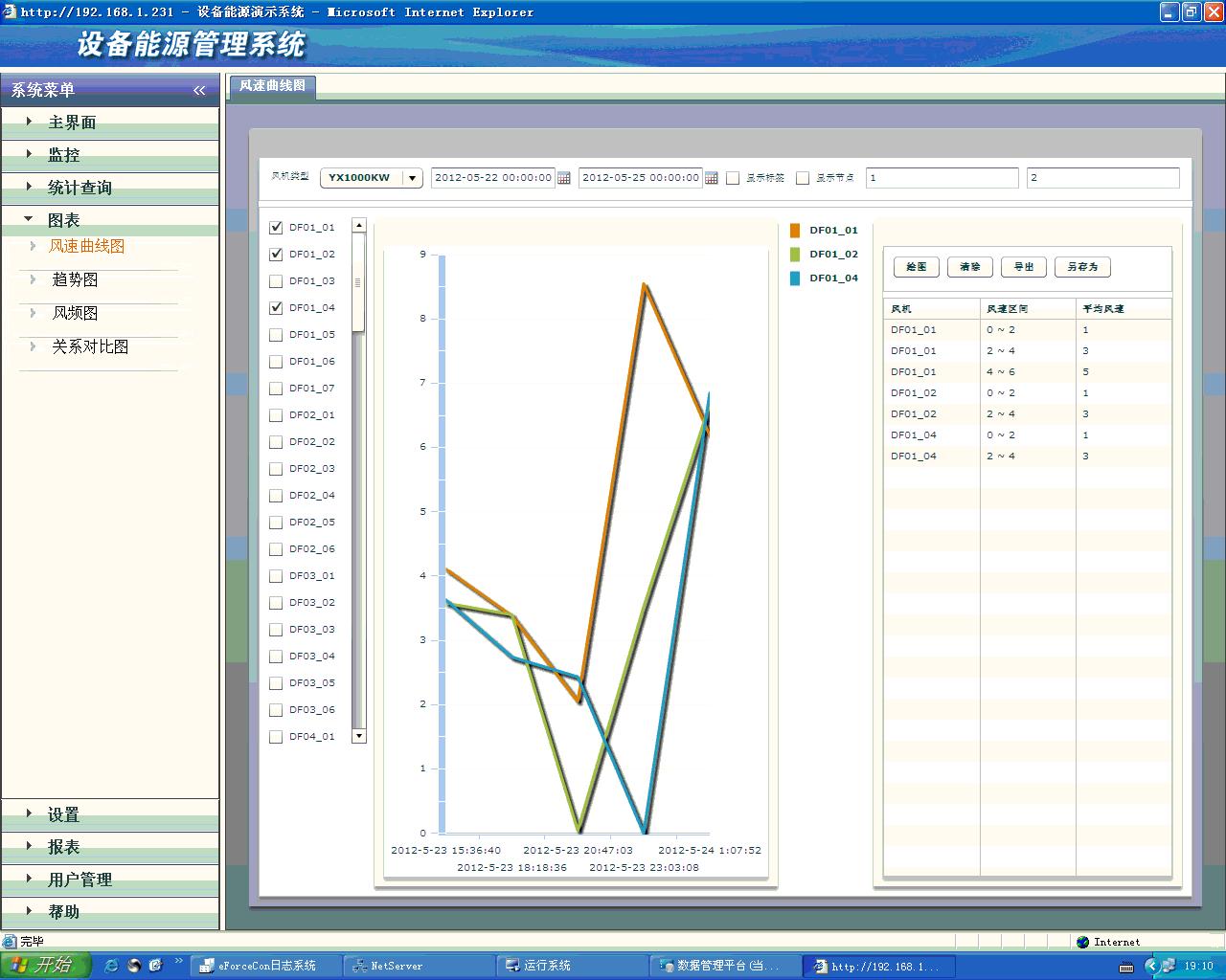 1)風速曲線圖:根據設定時間段、數據差值,描繪風速變化軌跡,并根據設定起始風速及區間,自動統計于右側表格。