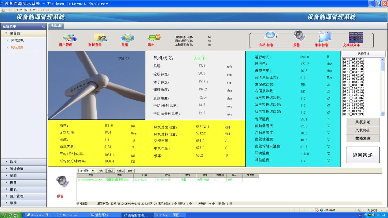1) 顯示機組的運行數據,如機組的瞬時發電功率、累計發電量、發電小時數、風輪及電機的轉速和風速、風向等,用風玫瑰圖、曲線或圖表的形式直觀地顯示出來。