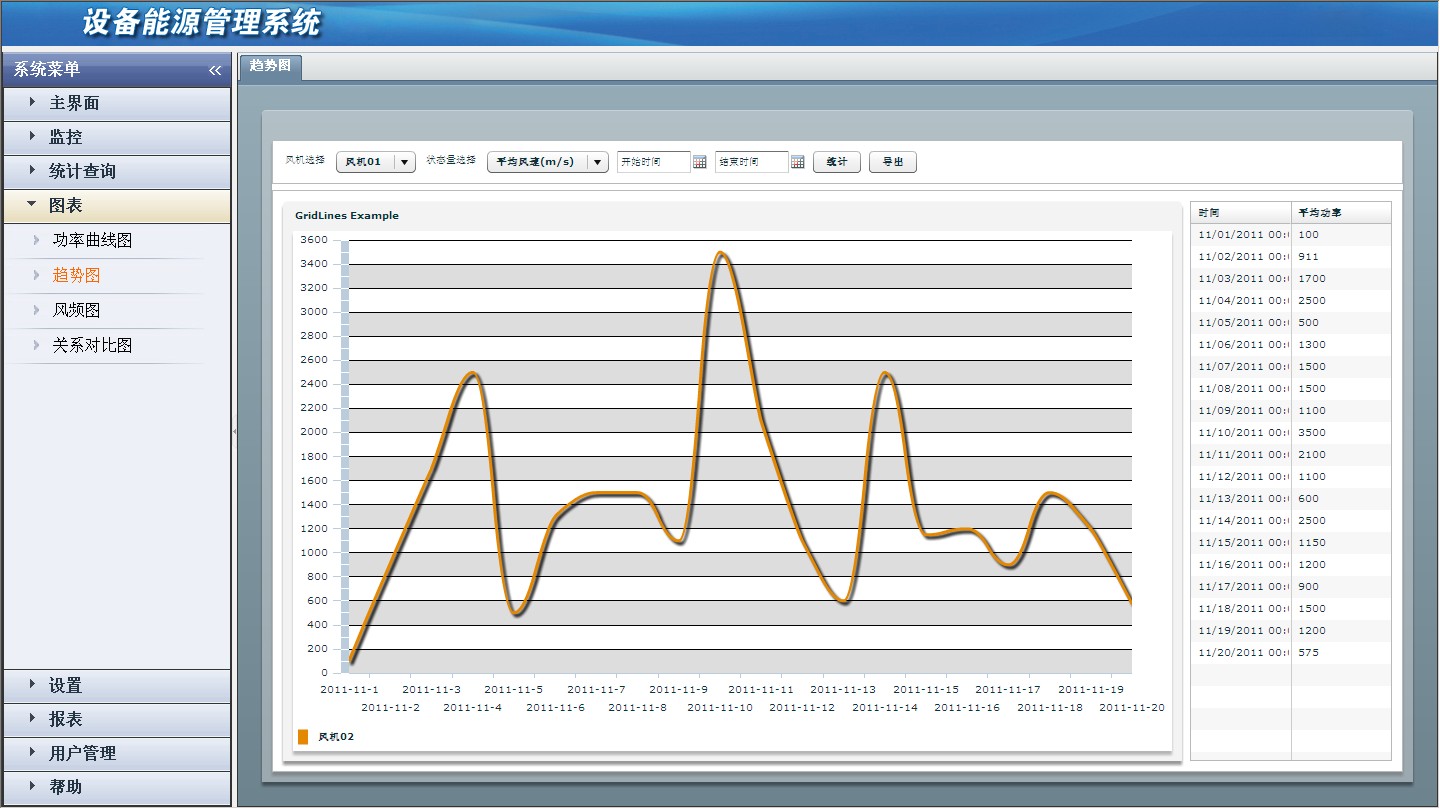 2)趨勢圖:在設定時間段內將風機所有變量的數據記錄獲取到右側表格,且于左側區域以曲線方式表現。