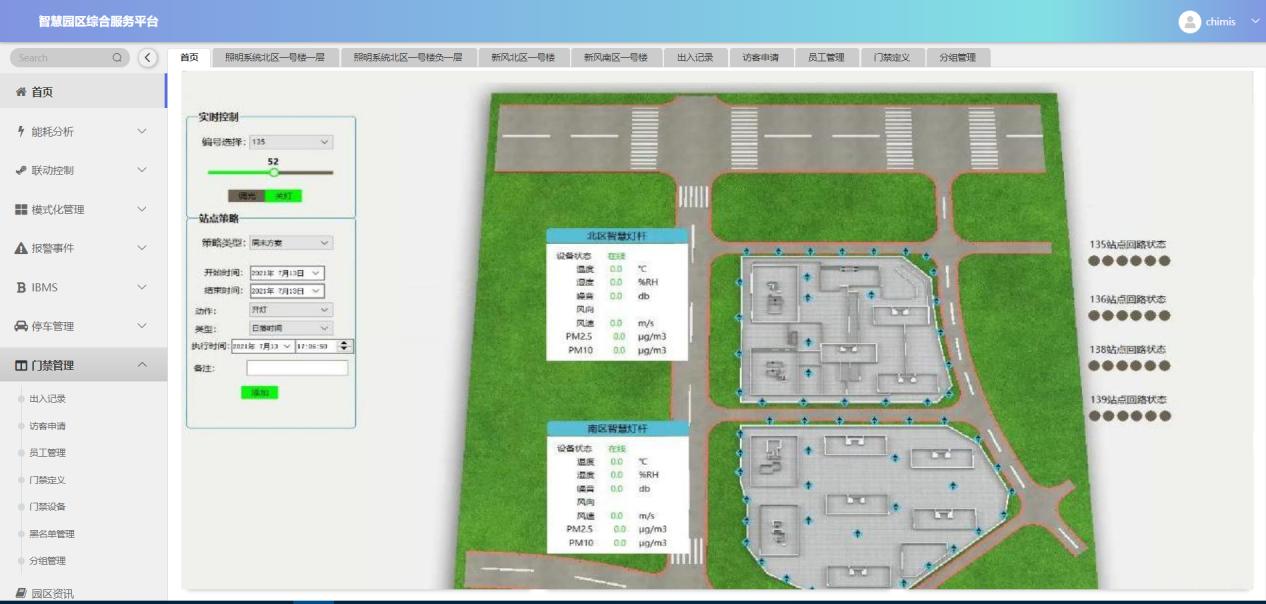 照明智能調(diào)節(jié):室外照明結(jié)合光感規(guī)則,綜管平臺根據(jù)日出日落時(shí)間自動(dòng)下發(fā)指令開閉室外燈桿;室內(nèi)照明則在無訪客預(yù)約時(shí)段自動(dòng)關(guān)閉展廳燈光。
