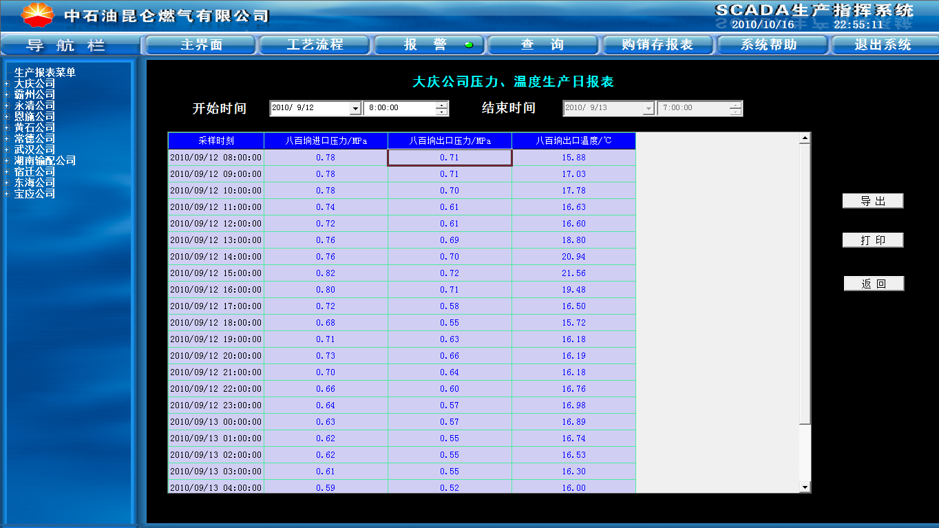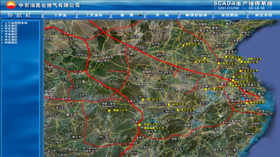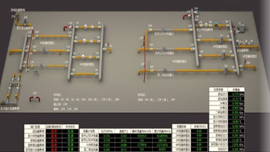 系統可將分布在各個區域的站庫所采集的管網設備的運行參數匯集到調度監控界面上來,并結合GIS系統提供的天然氣管網地理信息,整體顯示所轄區域內管網運行的狀態信息,并將管網各監測點的信息(壓力、溫度、流量等)實時地顯示在中心的大屏幕監視屏上。
