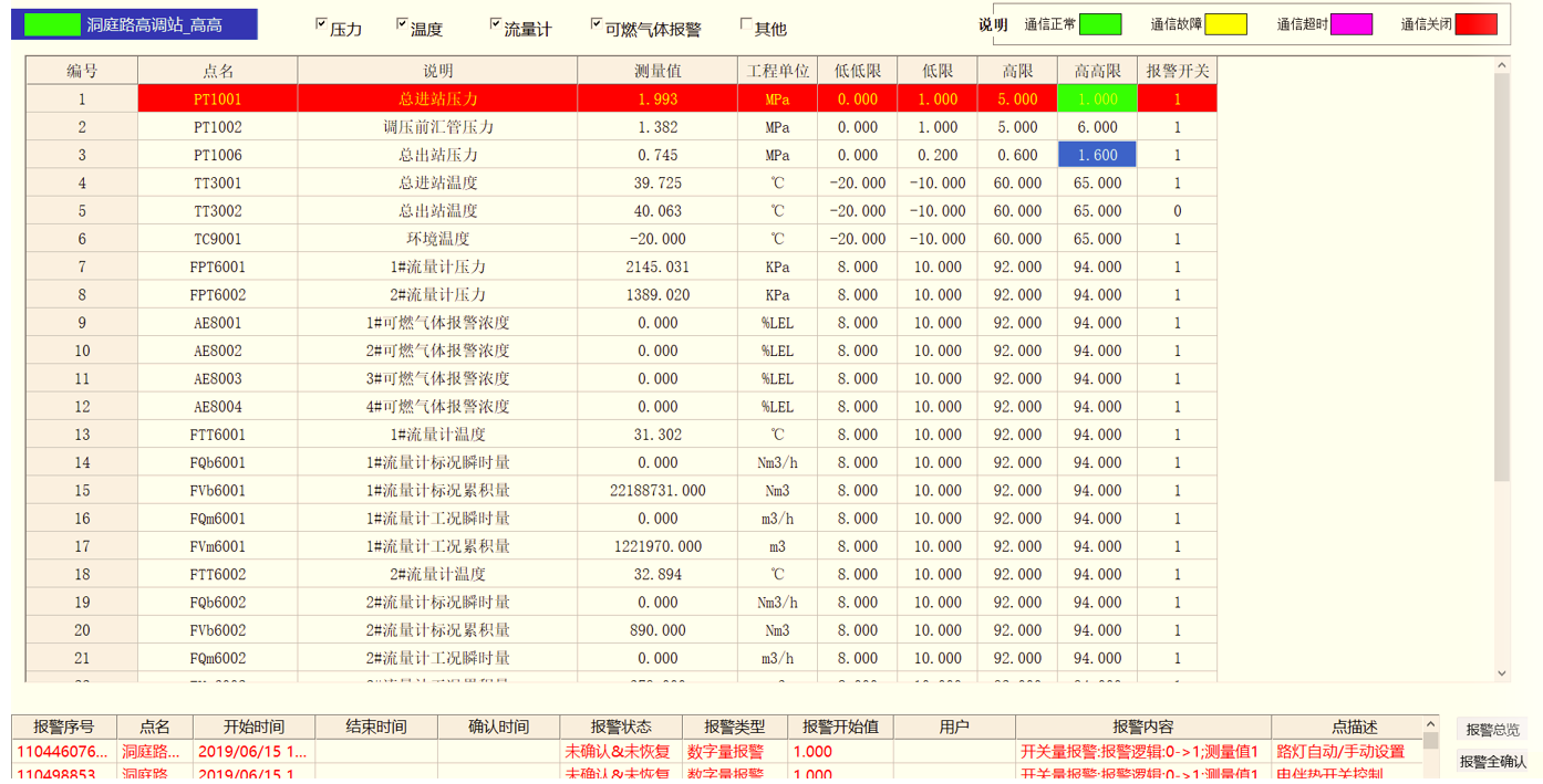 系統可實時顯示并記錄就地流量測量系統的各種報警信息,如流量/壓力的超限、儀表工作電源不正常、閥門工作異常、通訊故障等報警信息。此外燃氣調度中心系統具備嚴格的權限管理功能及操作跟蹤功能,記錄所有用戶操作過程,對出現的系統安全問題提供調查的依據和手段。