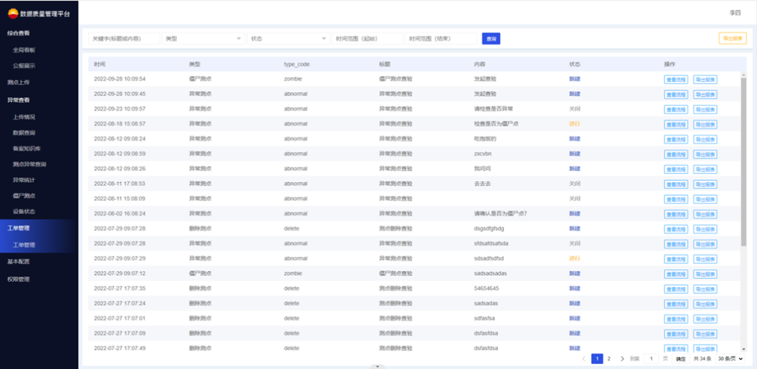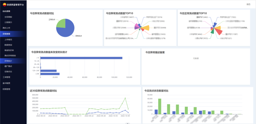 • 提供數(shù)據(jù)質(zhì)量分析系統(tǒng),檢驗數(shù)據(jù)標簽合規(guī)性、統(tǒng)計分析數(shù)據(jù)質(zhì)量、異常測點監(jiān)控、僵尸點管理、場站通信狀態(tài)及工單應用等功能。