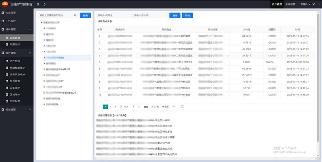 設備資產(chǎn)服務器部署力控設備資產(chǎn)系統(tǒng),對公司各重點設備資產(chǎn)進行管理,用戶可自行選擇設備展示實時生產(chǎn)數(shù)據(jù)及靜態(tài)數(shù)據(jù),按氣礦層級結(jié)果查看某場站某設備當前運行情況及設備臺賬信息。
