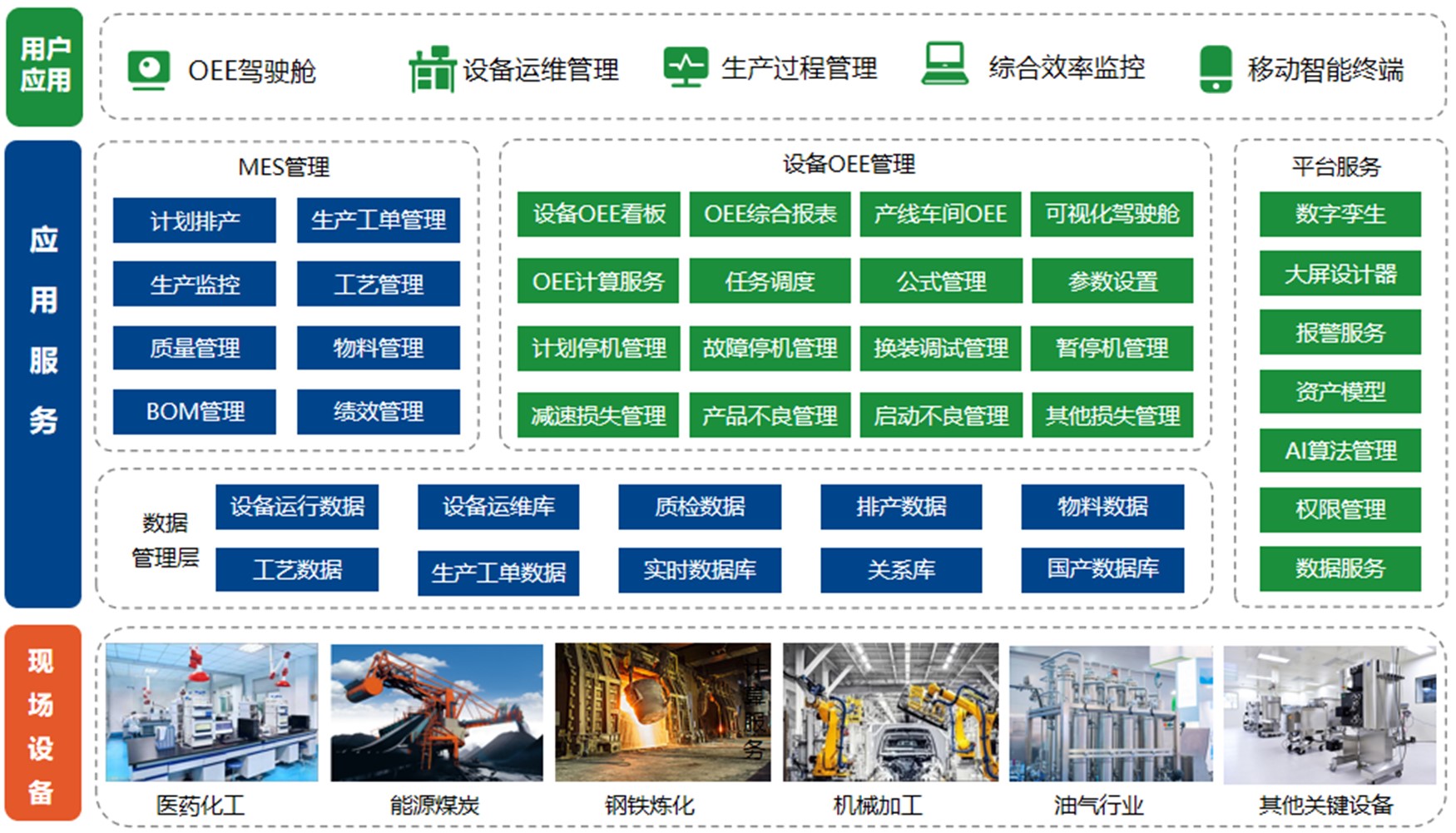 OEE計算服務能夠實現可用性、性能和質量指標的綜合計算,形成覆蓋設備、生產線、車間等多層級的OEE綜合分析,運用大屏可視化、報表和數字孿生等手段實現數據可視化展示。