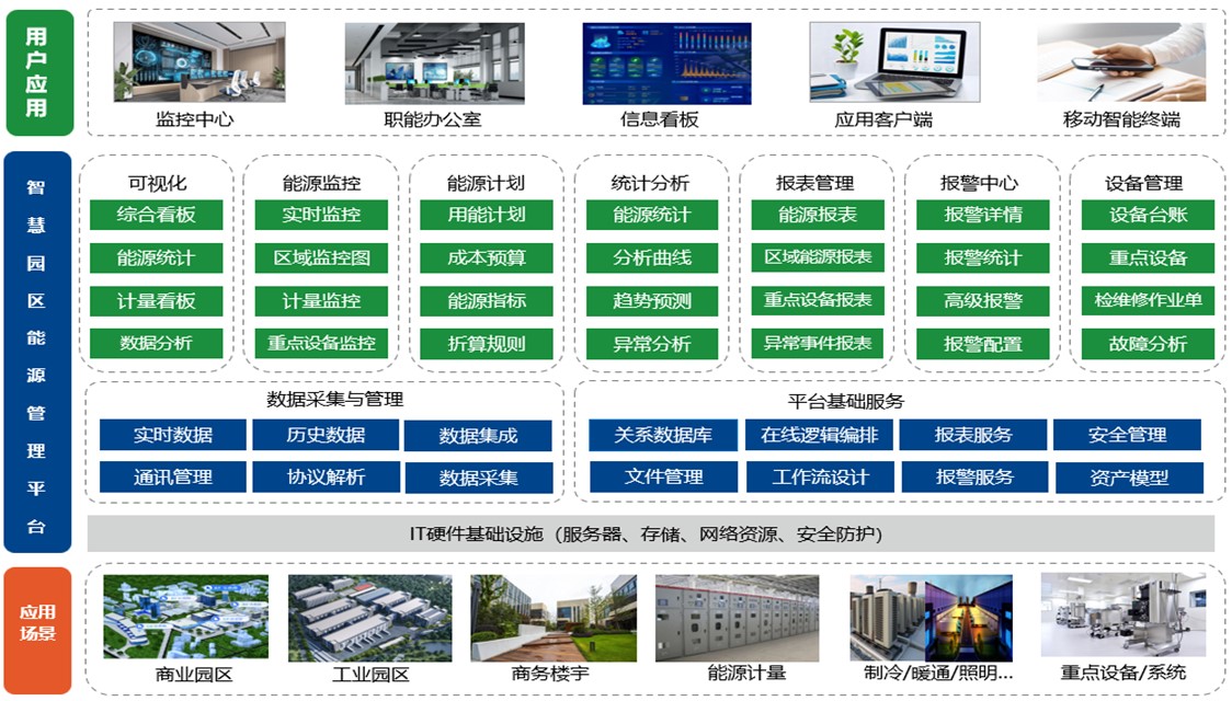 隨著園區不斷發展與升級,能源管理存在能耗監測不準確、數據分散、能效分析不足、各業務環節隔離等問題,急需建設新的能源管理平臺,便于園區管理人員、物業運維人員及時了解園區能源使用情況,提升能效,保障能源供應,符合相關的能源監管規范等。