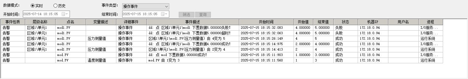 事件服務(wù)采用獨立存儲機制,將事件數(shù)據(jù)獨立管理,與運行日志分離,提升查詢效率。例如,用戶只需在事件界面選擇所需查看的事件類型,或是輸入描述關(guān)鍵詞如“泵A故障”,即可快速找到相關(guān)記錄。