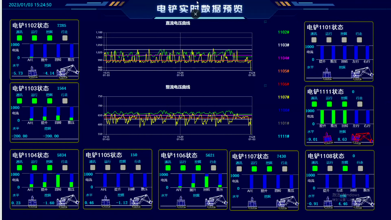 實現對各電鏟工藝流程圖實時監測畫面,畫面支持數字、動畫、圖表、曲線等顯示方式