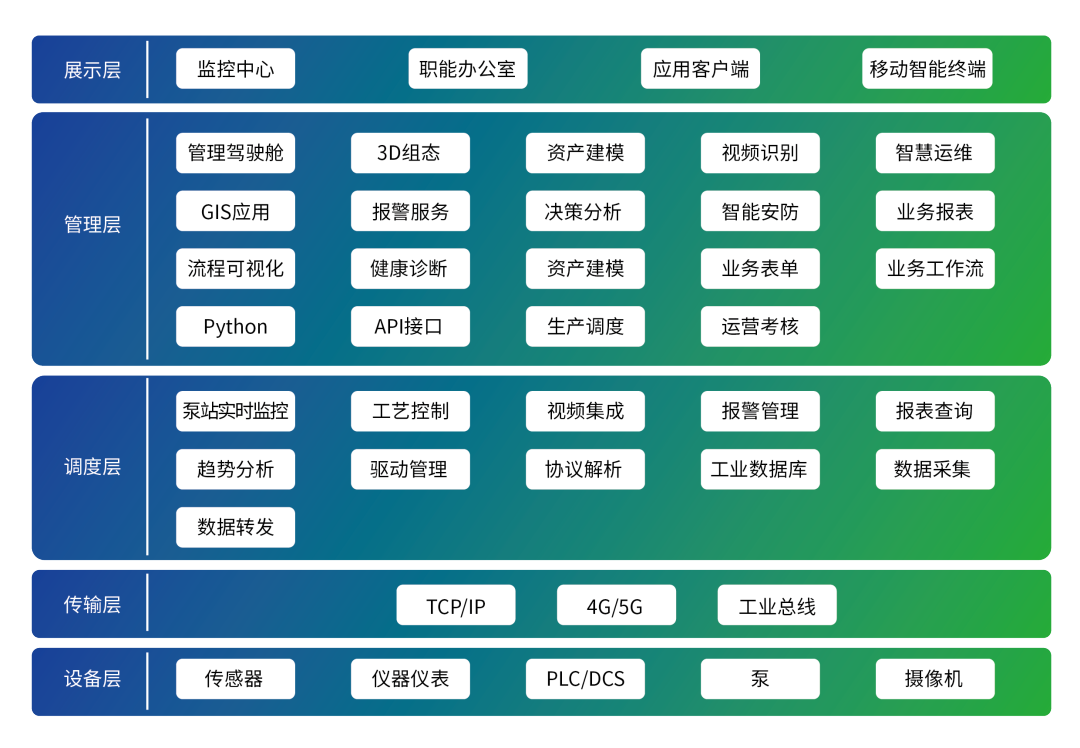 系統以物聯網為基礎,于泵站關鍵處部署各類傳感器及智能設備,全方位采集設備、工藝、環境及能耗數據,搭建起泵站運行的感知網絡。通過穩定通信網絡,數據實時傳輸至處理中心,經大數據分析與人工智能算法深度挖掘處理,實現泵站的自動化、精細化管理,提高運行效率,降低成本,保障供排水安全穩定。
